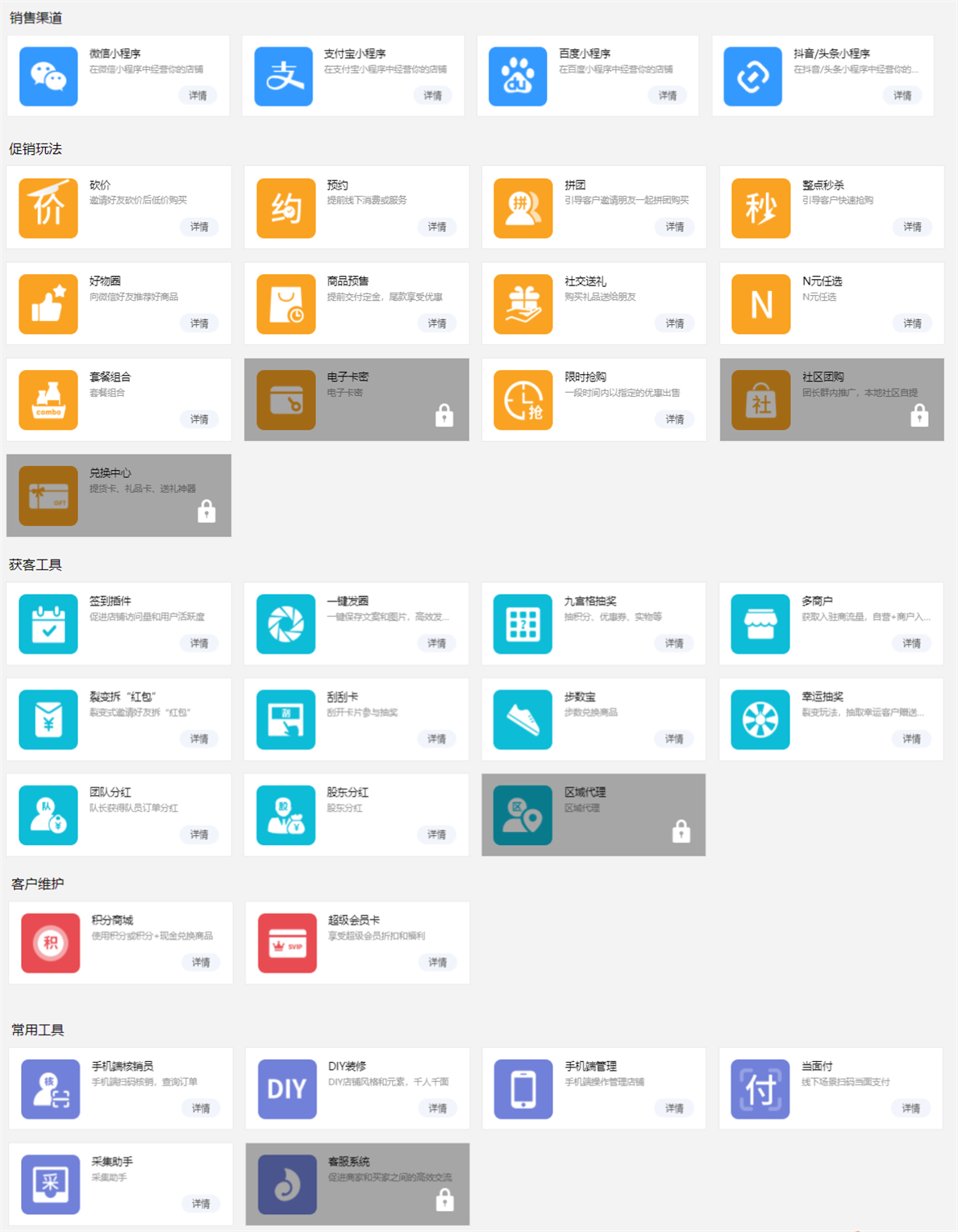 文章發(fā)布、推廣吸粉、店內(nèi)活動(dòng)運(yùn)營(yíng)、新品推出、節(jié)日活動(dòng)、朋友圈推廣、金蛋免單及拼團(tuán)活動(dòng)、用戶(hù)留存等。